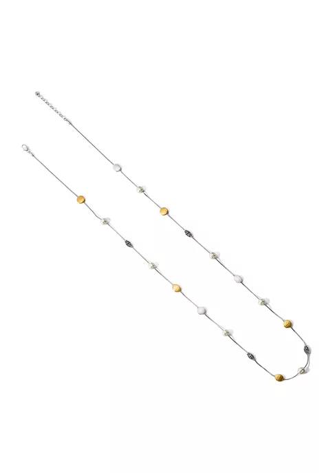 Handmade baroque pearls hammered gold and silver disks, and scrolled beads dot this long silver necklace at regular intervals. Wear it long or double it and wear it short. It’s a great layering piece!