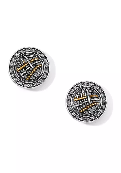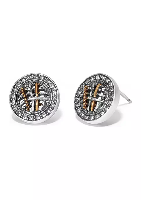 Inspired by the mystique of Neptune, these delicate silver and gold earrings use the familiar two-tone “rings” to create a pillow-shaped “woven” design. Fine crystals adorn the perimeter of each piece giving it a classic refined quality.